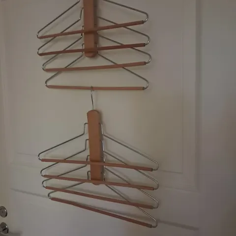 Yksi vähän käytetty ja neljä täysin uutta housuhenkaria (paketissa).