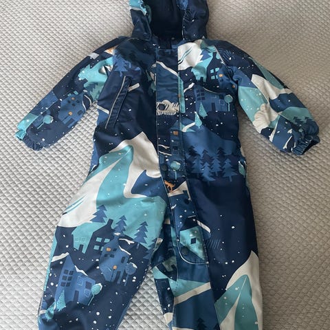 Väritys on violetin kirjava, tummalla pohjalla karhuja. Haalarissa on huppu, jossa tekoturkisreunus, vetoketjukiinnitys edessä sekä joustokiristys vyötäröllä. Lahkeissa ja hihoissa on kuminauharesorit, joissa vähän kulumaa.