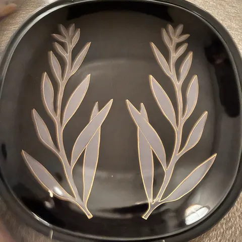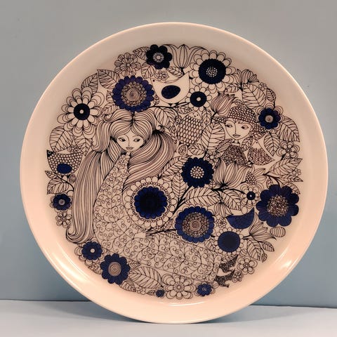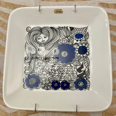 Arabia Pastoraali seinälautanen, Esteri Tomulan suunnittelema. Neliönmuotoinen, valkoinen pohja ja mustasininen Pastoraali-kuvitus keskellä. Lautasen takana Arabialle tyypillinen leima “Pastoraali Arabia Made in Finland”. Vanhaa tuotantoa, 60-luvulta.