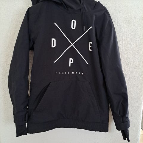 Dope:n XXS-kokoinen kevyttoppatakki. Naisten puolelta ostettu, mutta on mielestäni unisex-mallia. Muodoltaan suora. Itse käytin tätä XS-kokoisena ja oli päällä silti rento. Edessä nappikiinnityksellä rintataskut ja takin sisäpuolella yksi vetoketjullinen povitasku. Vetoketjulla irrotettava harmaa huppu. Ilman huppua takki on kiva paitatakki. Hihoissa kiristysmahdollisuus tarroilla. Tarrat ehyet. Vähän pidetty ja myydään eteenpäin, koska jäänyt itselle pieneksi.