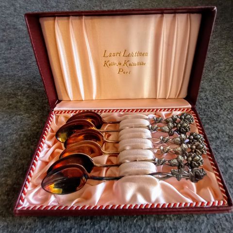 laatikko 20,5 x 20,5 x 2,5cm, 1950-luvulta, sisällä metalli lautanen tarjotin, halkaisija 20cm, ei leimaa, hieman ajan patinaa.