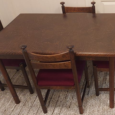 Pyökinvärinen kotimainen massiivipuinen jatkettava ruokailuryhmä neljälle. Pöydän koko 136 x 90cm, jatkopaikan leveys 40cm. Yleisilmeeltään siisti. Jotakin käytönjälkiä löytyy pöydästä ja tuoleista. Pahimmista pöytälevyssä olevista naarmuista lähikuva, muutossa tulleet. Todella painava pöytä! Halutessaan saa mukaan tuolinpäälliset, ne vaatii jo pesua.