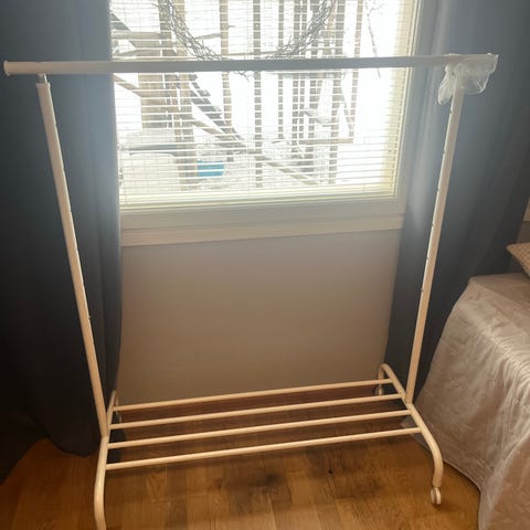 Pari vuotta sitten tokmannilta ostettu, pyörillä toimiva vaaterekki, ollut nyt ns. turhana sisustuksessa. Pieniä käytönjälkiä löytyy mutta muuten ehjä ja siisti. Pituutta pystyy säätämään