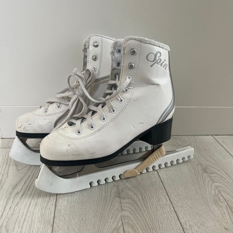 Spin taitoluistimet, koko 38. Väri valkoinen. Luistimissa on nauhakiinnitys ja perinteinen taitoluistinterä, joka soveltuu muuhun luisteluun. Pinta on sileä ja sisäosa pehmustettu mukavuuden lisäämiseksi. Terät ovat metallia ja kantapää musta. Sopivat esimerkiksi harraste- ja ulkoluisteluun.