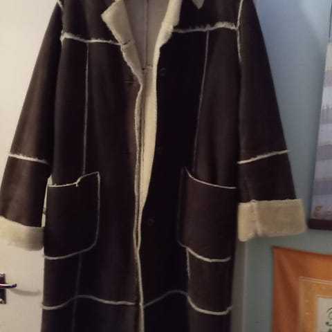 Naisten pitkä takki, koko M. Materiaalina tekoturkis, ulkopinta ruskea ja sisäpinta pehmeää, karvamaista tekoturkista. Takissa on huppu, etuvetoketju ja suuret etutaskut. Malli on polvipituinen tai hieman sen alapuolelle ulottuva. Puolikas rinnan ympärys 51cm. Puolikas vyötärön ympärys 44cm. Pituus olalta helmaan 92cm. Erittäin vähän käytetty. Ei käytön jälkiä.
