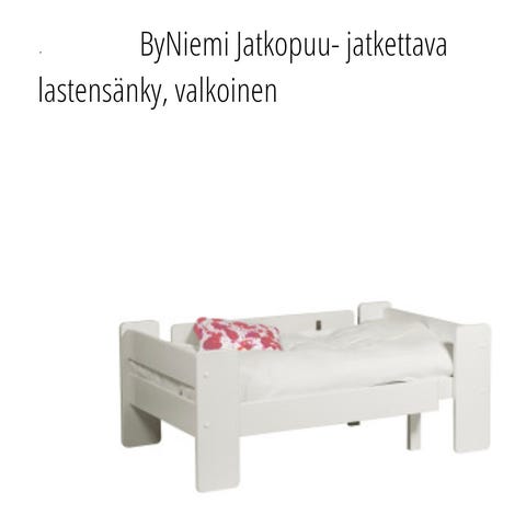 Valkoinen Unipuu juniorisänky. Lasten sänky matalalla runkorakenteella. Sängyssä on puinen runko ja sälepohja patjalle. Soveltuu käytettäväksi lastenhuoneessa yksittäisenä sänkynä tai osana Unipuu-sarjan kalustekokonaisuutta. Mukaan toiselle pitkälle sivulle kiinnitettävä vankka laita. Mitat 86cmx200. Nouto Hyllykallio, Seinäjoki.