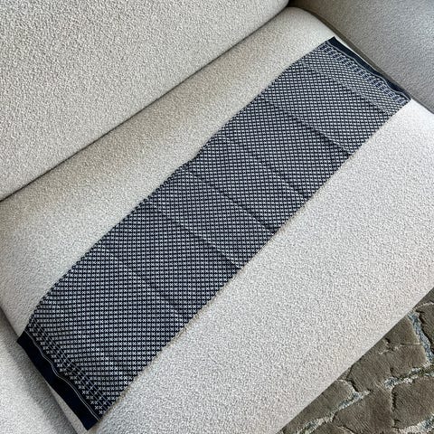 Ensimmäisessä kuvassa on kaksinkerroin. Pituus n. 130 cm ja leveys n. 40 cm. Ilman hapsuja.