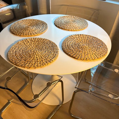 Jysk Jegind ruokapöytä, Pyöreä ruokapöytä, jossa luonnonvärinen tammea jäljittelevä pöytätaso ja mustat jalat.