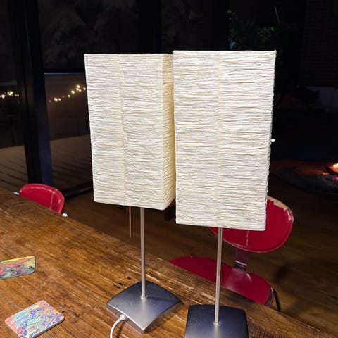 Kaksi pöytävalaisinta esim yöpöydille. Ostettu ikeasta eri aikoina, vierekkäin huomattavissa että toinen hieman korkeampi (en ole huomannut käytössä, ennenkuin vasta kuvia varten vierekkäin laittaissa. Sopii E27 kantainen lamppu.