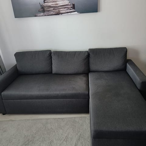 Sohvan kangas muutoin kaikin puolin ehjä. Koiratalous joten karvaa varmasti löytyy vaikka sohva on putsattu.