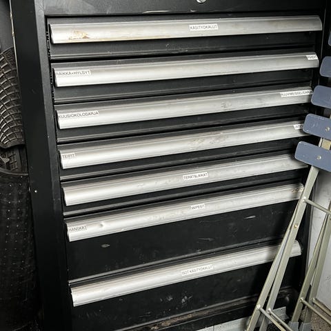 Sovella työkalukaappi vetolaatikoilla ja pyörillä. Kaapissa on useita eri kokoisia vetolaatikoita työkalujen ja tarvikkeiden säilytykseen. Neljä pyörää joista kaksi lukittavia. Työskentelytaso mallia tukeva. Soveltuu esimerkiksi autotalliin, verstaaseen tai muuhun työtilaan työkalujen ja pientarvikkeiden järjestämiseen.