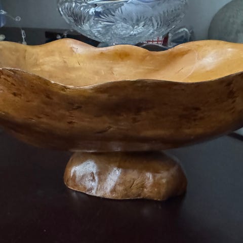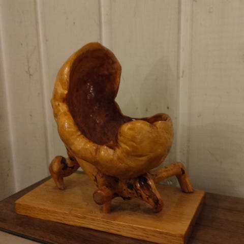 Myydään näyttävä pahkasta valmistettu käsityökoriste. Uniikki kappale, jossa luonnollinen puun muoto ja oksajalusta. Pohjassa merkintä VJ-74 (todennäköisesti tekijä + vuosi 1974). Kork.17cm.