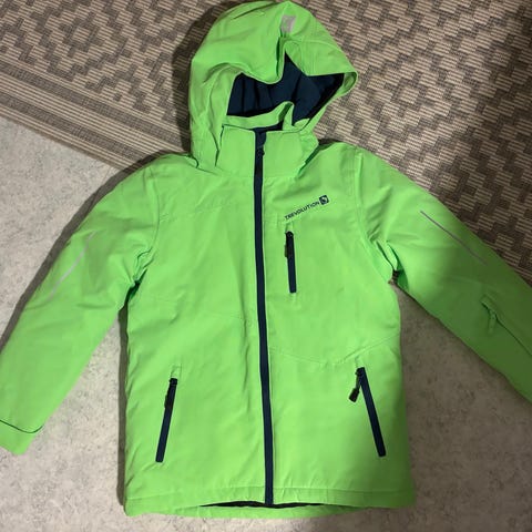 Five Seasons toppahousut ja Lassie tec takki, koko 128. Pukuun kuuluu kirjava, mustan, harmaan ja valkoisen sävyinen toppatakki sekä yksiväriset tummat toppahousut olkaimilla. Materiaalina on kestävä kangas, jossa on toppavuori kylmää säätä varten.