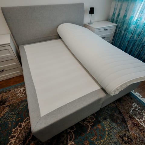 Sijauspatja 180X200 on ostettu aikoinaan Ikeasta 160€:lla. Siinä on tahroja, mitä voi helposti pestä pois. Sänkyä voi ostaa ilman s.patjaa, mutta se tulee paketin mukana 0 hintaan.