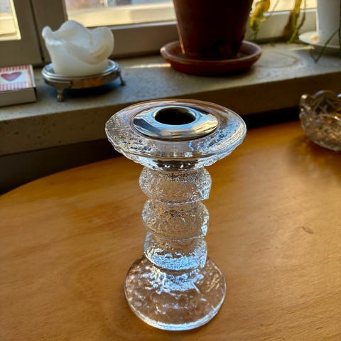 Iittala kynttilänjalka lasia. Kynttilänjalassa on koristeellinen, kohokuvioitu pinta ja se on tarkoitettu pöydälle asetettavaksi. Sopii esimerkiksi kruunukynttilälle tai vastaavalle kynttilätyypille. Materiaali on läpikuultavaa lasia.