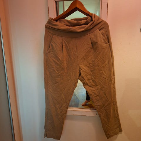 Myydään leveälahkeiset Nosh housut. Koko S. Kiva beige väri keväseen/kesään. Mukavat ja joustavat päällä. Sivutaskut. Hyvä kunto.