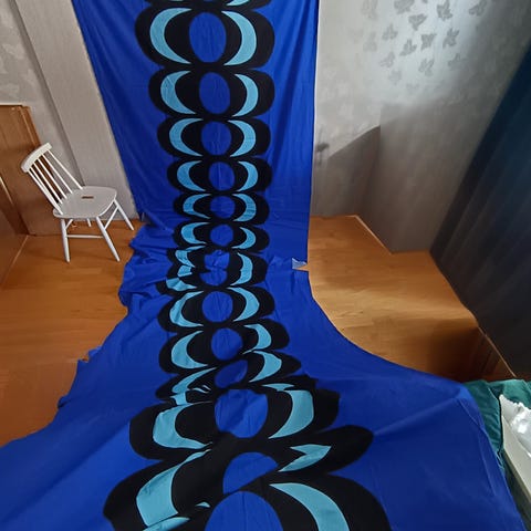 Marimekko Kaivo kangas. Kuosissa on kaarevia muotoja beige, mustan ja valkoisen sävyissä. Materiaali on puuvillaa. Kangas soveltuu esimerkiksi sisustuskankaaksi, verhoihin, pöytäliinaksi tai ompeluprojekteihin. Reunassa on painettu Marimekko- ja Kaivo-kuosin tiedot. Noin 5,9 m x 1,4 m