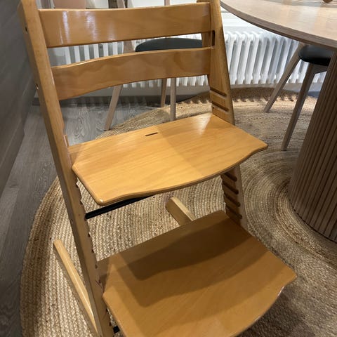 Stokke Tripp Trapp lastentuoli punaisena puuversiona. Tuolissa on säädettävä istuin- ja jalkataso, jotka voidaan asettaa eri korkeuksille ja syvyyksille lapsen kasvun mukaan. Valmistettu puusta, pinnassa näkyy kuvien perusteella paikoin kulumaa ja pieniä jälkiä. Soveltuu käytettäväksi ruokapöydän ääressä tai muuna istuimena lapselle.