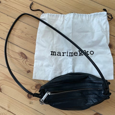 Marimekko nahkainen crossbody-lauku naisille. Laukku on mustaa nahkaa ja siinä on säädettävä olkahihna. Laukussa on vetoketjukiinnitys ja sisäpuolella vetoketjutasku pienten tavaroiden säilytykseen. Mukana tulee Marimekko-kankainen säilytyspussi.