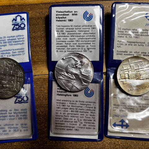 Suomen Rahapajan juhlarahat, hopeaa. Setissä kolme juhlarahaa 60€ yhteensä