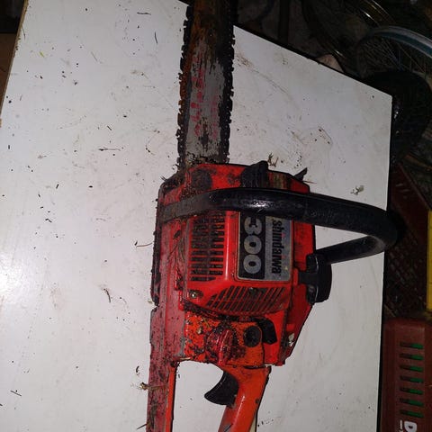 Vanha shindaiwa 300s moottorisaha ilman laippaa ja ketjua.