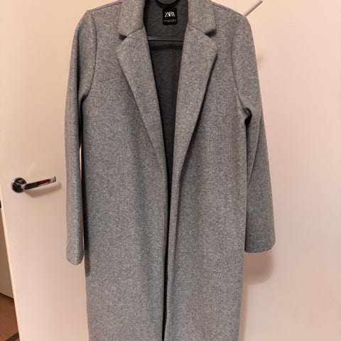 Zara pitkä takki, naisten koko M. Väri musta ja materiaalina polyesteri. Takissa on kauluskäänteet, nappikiinnitys edessä ja etutaskut. Vuorillinen malli, pituus suunnilleen polven tienoille kuvien perusteella. Soveltuu arki- ja siistimpään pukeutumiseen viileämpiin säihin.