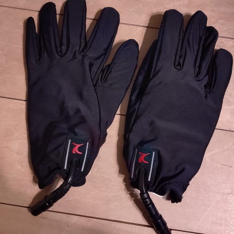 Lämpöhanskat. Johdoilla kiinni pyörään/kelkkaan. Sormenpäissä rispaantumista.