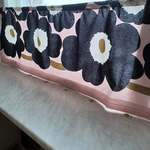 Uusi isokukkaisesta unikko kankaasta ommeltua kappaverho. Verhon kukat kevään muotiväri, hempeän vihreä. Verho sopii huoneeseen kuin huoneeseen.Tankokuja 5cm. Haku tai postitus