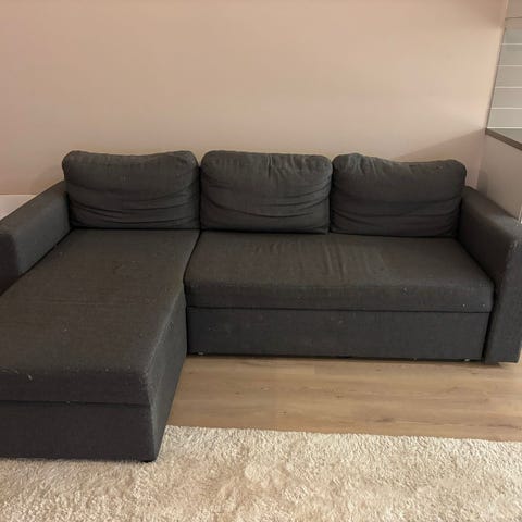 Harmaa divaanivuodesohva. Kangas ehjä. Divaaniosassa jousitus hajonnut osittain (kts.kuva), kestää kyllä istumisen painon siinä kohdassa. Ei lemmikkejä taloudessa.
