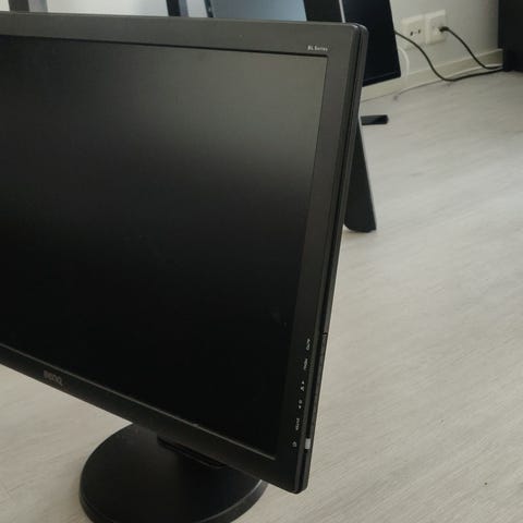 Toimiva, mutta usemman vuoden vanha näyttö. Koko noin 24", halkaisija noin 61 cm, leveys 53 cm, korkeus 30cm.
