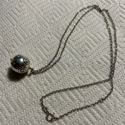 Kalevalan 925 hopeinen spiraalipallo kaulakoru alkuperäisellä Kalevalan pitkällä 60 senttisellä ketjulla. Vuosileima 1974.