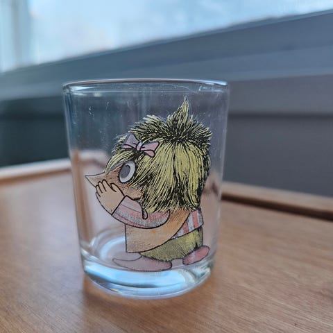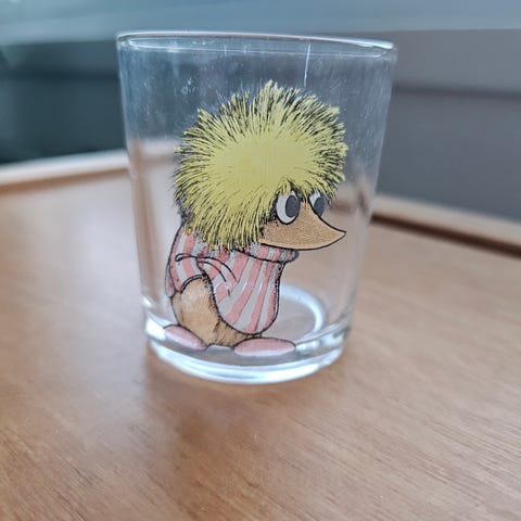 Haalistunut Peikko-kuvioinen vanha Fauni-lasi. Kolhuton ja sen puoleen ehjä.