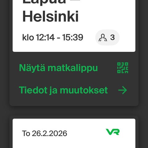 VR junalippu reitille Kemi–Helsinki. Lähtö Kemin asemalta klo 22:50 ja saapuminen Helsinkiin klo 10:34. Junana IC/YO 276, vaunu 43 alakerta, paikka 45 ikkunapaikka. Lipun matkustajatyyppi opiskelija. Lisäpalveluita ei sisälly. 29€
