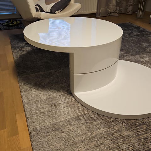 Valkoinen pyöreä pöytä, vähän jaloissa epätasapainoa. Siisti.