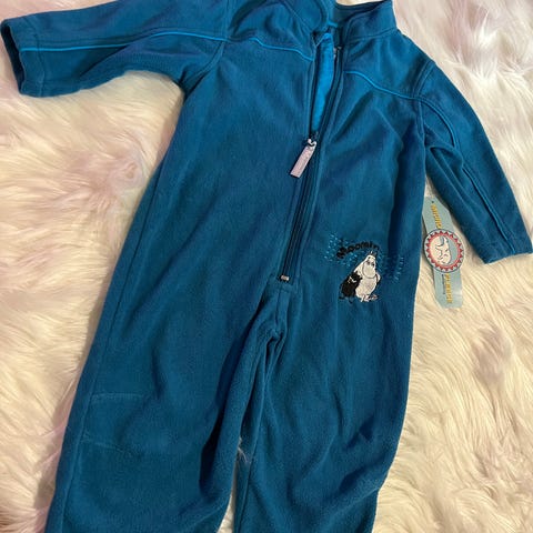 Muumi fleecehaalari, koko 80. Sininen unisex-mallinen haalari, jossa on Muumi-aiheinen kuosi. Valmistettu pehmeästä fleecemateriaalista. Soveltuu vauvalle tai taaperolle arki- ja ulkoiluvaatteeksi välikerrokseksi.