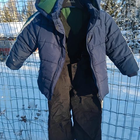 Takki mielestäni moitteettomassa kunnossa, toppahousujen henkselit osittain jo kuluneet, toinen jalkalenkki uupuu, lahkeissa hieman kulumaa sekä ihan pikku tahra pepussa, joka lähtee ehkä pesussa en ole kokeillut.