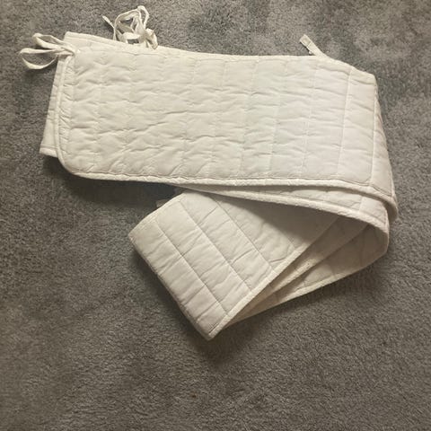 Ikean 150 cm pitkä pinnasängyn reunapehmuste. Tulee siis pään puoleiseen päätyyn, ei kierrä koko sänkyä. Juuri pesty myyntiä varten. Kunto siisti ja ryhdikäs. Pehmusteeseen sopiva ompelijalla teetetty Designers guildin laadukkaasta puuvillakankaasta ommeltu päällinen. Pitkä putki, jossa päissä nepparit. Omat nauhakinnikkeet. Yksi nauha puuttuu. Juuri pesty myyntiä varten. Siistikuntoinen.