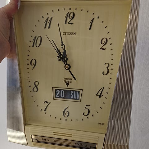 Citizen-seinäkello, jossa on musta kehys ja tausta. Kellotaulun keskiössä on kerroksittain aseteltuja värikkäitä geometrisia muotoja sinisen, turkoosin ja punaisen sävyissä. Kellossa on kvartsikoneisto, ja takapuolella on ripustusreikä seinäkiinnitystä varten.Kellon takana on Widemarkin tarra ja merkintä, että laite on tarkistettu.Paristokäyttöinen kvartsikoneisto.Valmistaja: CitizenVäri: musta, sininen, turkoosi, punainenMateriaali: muovi, lasi