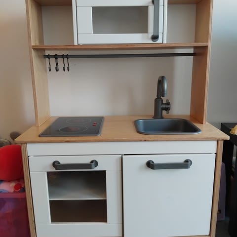 Valkoinen leikkikeittiö. Jämäkkää puuta/lastulevyä. Tukeva. Paljon leikitty, mutta edelleen ehjä sekä hyvä seuraaville leikkijöille. Naarmuja ja pölyä varmasti tulee mukana. Kuvan tarvikkeet eivät kuulu kauppaan.