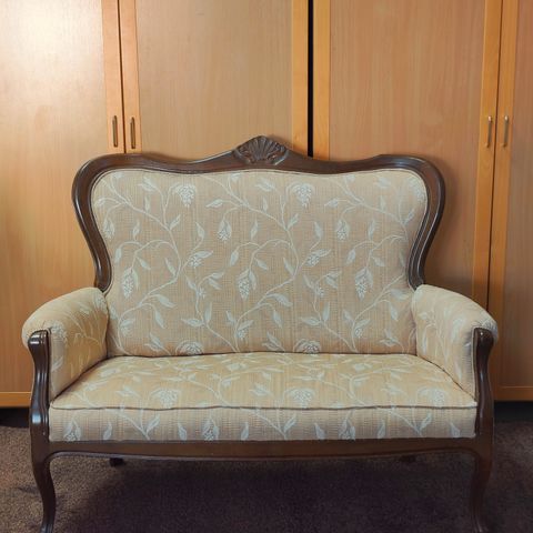 Runko on säilynyt tukevana ja rakenteellisesti vahvana. Sohva on uudelleenverhoiltu kangasvaihdon yhteydessä, ja verhoilu on lähes uudenveroinen.