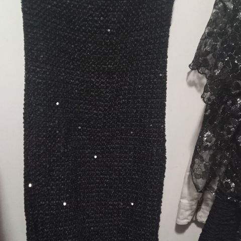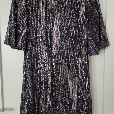 Istuva leikkaus, säädettävät olkaimet ja halkio vasemmalla puolella. Mekko on 95 % polyesteriä ja 5 % elastaania, joten mekko jousta. Alla kiinniommeltu alusmekko-osa.