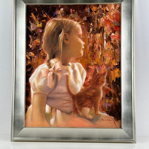 Paula Oksmanin painokuva "Tyttö ja lintu". Työn korkeus on 30 cm ja leveys 21 cm. Kehys 40 X 30 cm.