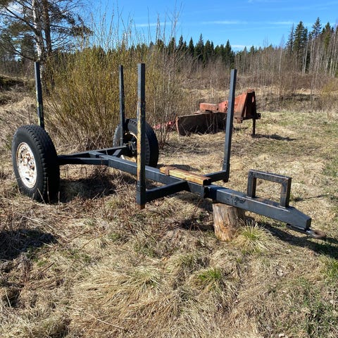 Kärry puun tai muun ajoon, Saabin pyörät, kiinteä teli, 250 x 150, uloin leveys 200. jatkettava aisa, tyhjänä siirtää käsin. Irroitettavan adapterin avulla voi vetää joko traktorilla tai mönkijällä