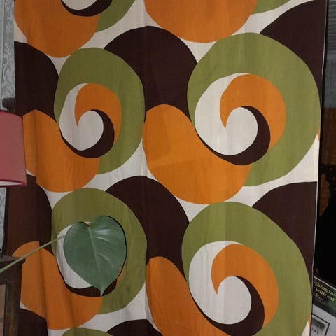Vintage verho, missä on hienot hehkuvat 70-luvun retrot värit ja kuviot.