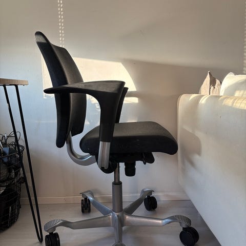 Tuoli on käytetty ja siinä on jonkin verran normaalia kulumaa, mutta kaikki säädöt toimivat moitteettomasti ja istuinmukavuus on edelleen erinomainen. Tukeva ja laadukas rakenne, suunniteltu kestämään vuosia.