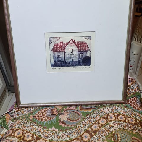 Kimmo Taskisen grafiikkatyö "Lemmikki" vuodelta 1995. Lasikehyksen korkeus on 29 cm ja leveys 24 cm.