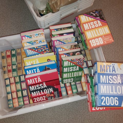 Mitä Missä Milloin -vuosikirjasarja, johon sisältyy useita vuosikertoja aikaväliltä 1958–1970. Kirjat käsittelevät kyseisten vuosien tapahtumia ja ilmiöitä kotimaassa ja maailmalla. Kovakantisia teoksia, joissa on runsaasti tekstiä, tilastoja ja kuvitusta. Sopii esimerkiksi tiedonhakuun ja ajankuvan tarkasteluun eri vuosikymmeniltä.