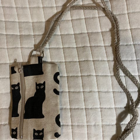 Käsintehty vuorellinen pussukka, jossa kiristys naruilla ja helmilä. Suloisia kissojen kuvia. Pyöreä pohja pitää pussukan ryhdikkäästi pystyssä.