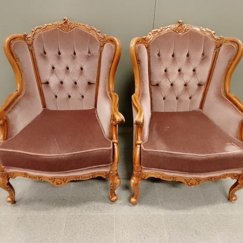 Hienot valkoiset rokokoo nojatuolit, joissa on vihreä kangasverhoilu. Vanhaa tuotantoa arviolta 1970-luvulta.