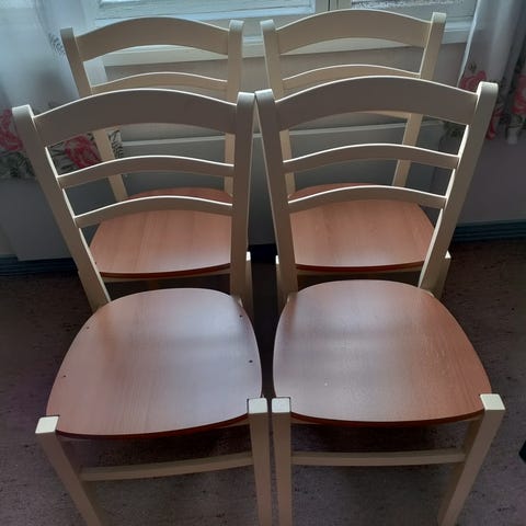 Ruokapöydän tuolit, joissa on kaksi erilaista mallia. Osa tuoleista on vaaleaa puuta, selkänojassa pystypinnat ja musta keinonahkainen istuin. Toisessa mallissa on musta verhoiltu istuin ja korkea selkänoja sekä metallijalat. Sopivat ruokapöydän tai neuvottelutilan istuimiksi. Myydään kuvien mukaisena kokonaisuutena. 6kpl ja 4kpl